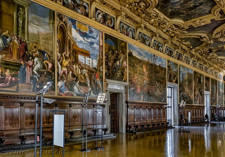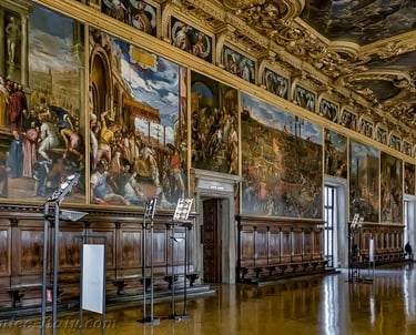 Stepping inside the Doge’s Palace is like stepping back in time, as visitors can explore the palace's monumental rooms, each with its own story to tell. The palace’s interior is a labyrinth of richly decorated rooms. The grand staircases, the opulent ballrooms, and the private apartments of the Doge all offer a glimpse into the lives of the powerful figures who once inhabited these halls.
